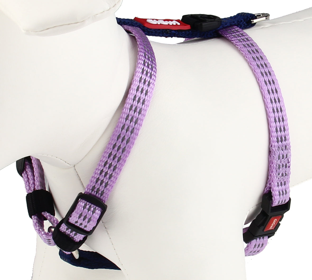 Arnés de la marca Australiana GiGwi, de color morado con azul. Permite ajustar el ancho en el cuello y tórax. Es de tamaño pequeño, como para un Chihuahua, Yorkshire Terrier o un Teckel miniatura. Permite enganchar una luz o GPS en el dorso.