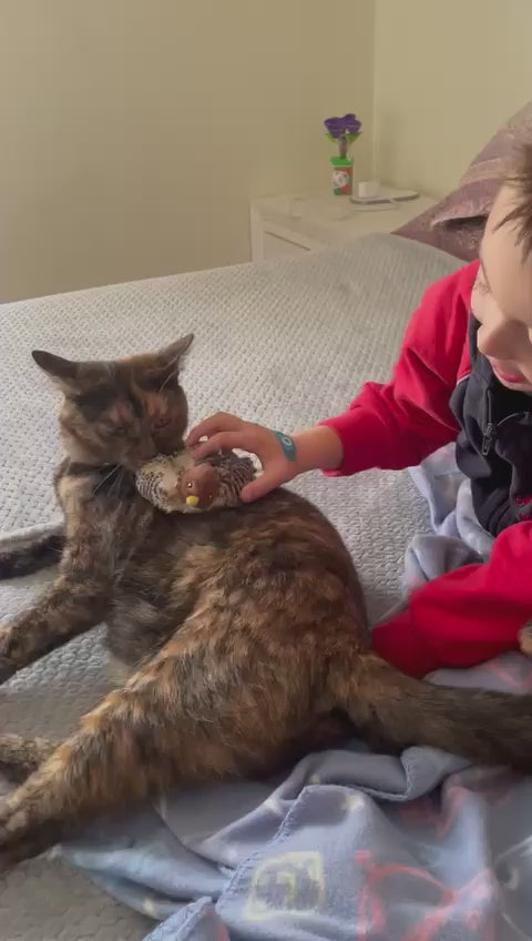 Juguete interactivo para gatitos que imita el sonido natural de una ave cada vez que se mueve, despertando su instinto cazador, dando horas de entretención.